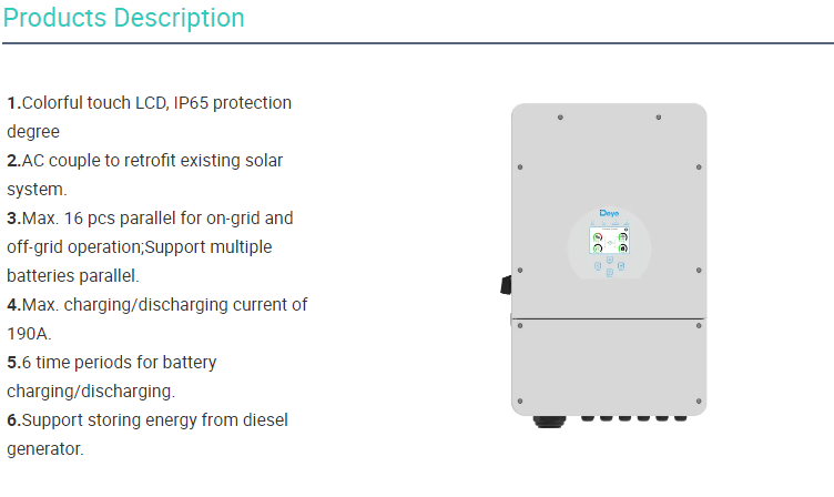 Output Type:Single Inverter Efficiency:97.6% Place of Origin:Anhui, China Model Number:SUN-10/12K-SG02LP1-EU-AM3-P Brand Name:Deye Input Voltage:370 (125-500)V Output Voltage:220/230V Output Current:50/47.9A Output Frequency:50Hz/45Hz-55Hz 60Hz/55Hz-65Hz Size:420x670x233mm