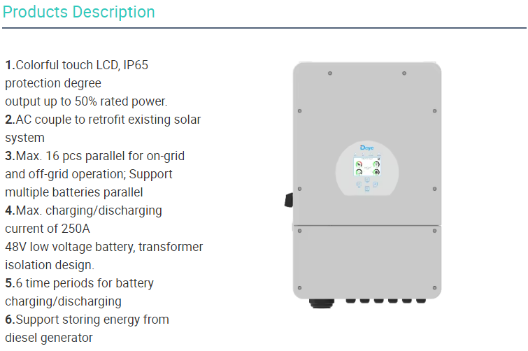Output Type:Split Phase Inverter Efficiency:97.6% Place of Origin:Anhui, China Model Number:SUN-10/12K-SG02 LP2-US-AM3 Brand Name:Deye Input Voltage:150-425V Output Voltage:120/240; 208 0.88Un<U<1.1Un Output Current:50A Output Frequency:50/60Hz Size:420*670*233mm (Excluding Connectors and Brackets)